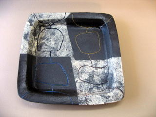 | 黒地白泥線象嵌角皿 | 作者 佐藤さん (男性) 黒粘土を使いタタラ作りで板を作り、角皿の型に 被せ成形します 乾燥後、型を外し形を整えます 白泥をスポンジに付け対角に叩き、線模様を刻みます 乾燥させ素焼きし、線部分に黄・トルコブルー・ コバルト青の色泥を象嵌します 再度素焼きし灰マット透明釉を スプレーで薄掛けし1265度の酸化焼成します (コメント) 白泥のかすれ具合が良い雰囲気を出しています |