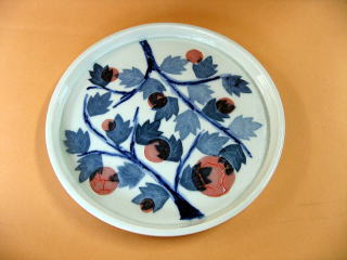 作者 茶野(男性) 半磁土を使いロクロ成形します 高台を削り実の赤丸部分を削り赤泥を象嵌します 素焼きし幹の部分を呉須で描き入れ、葉の部分は 和紙を木の葉形に切り呉須で和紙染します 3号石灰釉を掛け1268度の還元焼成します (コメント) 和紙染の濃淡が良いです |