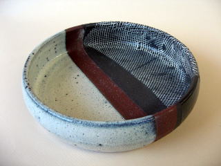 作者 佐竹さん(女性) 黒粘土を使いロクロ成形します 高台を削り和紙を三角と線に切り水で張り付けます 上から蚊帳の布を被せ、白泥を刷毛塗し全体を 指先で擦ります 蚊帳と紙を剥がし、乾燥させ素焼きします 灰マット透明釉をスプレーで薄く掛け1265度の 酸化焼成します (コメント) 白の蚊帳目模様の濃淡が変化が在り楽しいです 抜いた三角模様も調和が取れています |