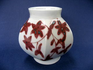 | 銅赤花文五角壺 | 作者 長谷川さん(男性) 半磁土を使いロクロ成形し、乾燥後高台を削ります 胴部分を五分割し、叩き板で叩き変形させます 素焼き後銅を含んだ絵具で花模様を描き、全体に 3号石灰釉を浸し掛けし1268度の還元焼成します (コメント) 銅を使った絵具は、塗る厚みで発色が変わります 五角に分割された形に良く合っています |