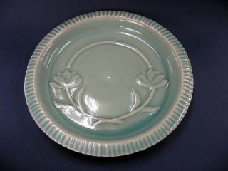 作者 茶野さん (男性) 半磁土を使いロクロ成形します 高台を削り皿縁部分に彫線を刻みます 内面に花模様を、薄いタタラ作りの板を切り出し 貼り付けます 乾燥後、素焼きし青磁釉を浸し掛けし、1268度 の還元焼成します (コメント) 皿縁の刻み線があることで花模様が引き立っています |