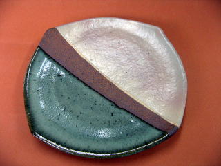 | 掛け分け四方皿 | 作者 神澤さん (男性) 唐津赤土を使いロクロ成形します 高台を削り、四方にカットし斜め上部分に萩化粧を 掛け乾燥後素焼きします 真ん中斜めに撥水剤で留め萩化粧の部分は1号 石灰釉を薄掛けし、下部分は藁白釉掛け1268度 の還元焼成します (コメント) 萩化粧の部分が写真では分かりにくいですが、 変化があり三食の色の変化を楽しめるお皿に 仕上がっています |