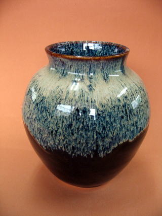 | 乳白釉流し掛け壺 | 作者 和田さん(男性) 朝鮮土を使いロクロ成形し、乾燥後高台を削ります 素焼きし全体に飴釉を浸し掛けし、口辺の立ち 上がり部分まで乳白釉を付けます 1265度の酸化焼成します (コメント) 飴釉の上に乳白釉を掛けると流れます、流れの中に 複雑な色の変化が出てきます |